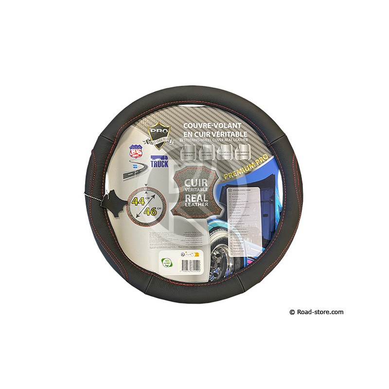 COUVRE-VOLANT 44-46 10CM CUIR VERITABLE NOIR SURPIQURE ROUGE